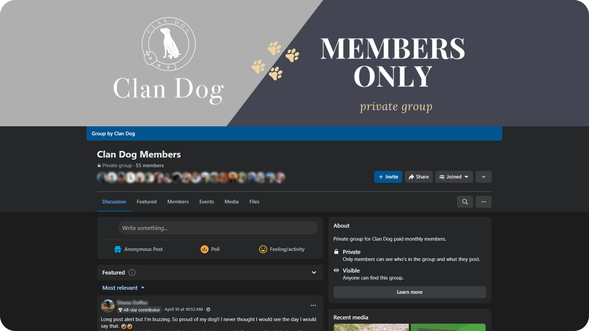 Join a vibrant community of like-minded dog owners and enthusiasts. Our members-only Facebook group is a safe space to share experiences, seek advice, and celebrate successes. Connect with others who understand the joys and challenges of dog ownership, and benefit from the collective knowledge and support of the Clan Dog community.